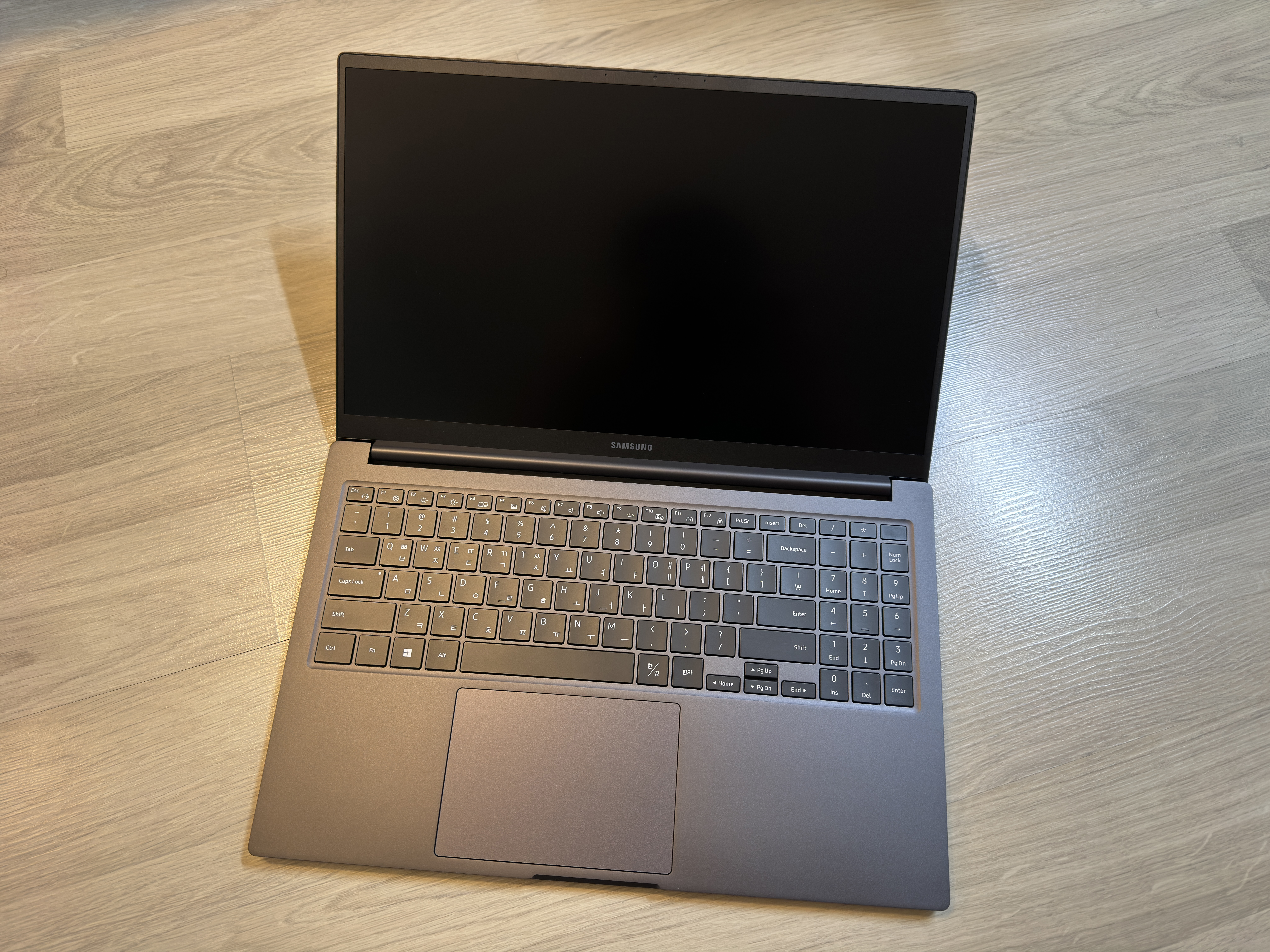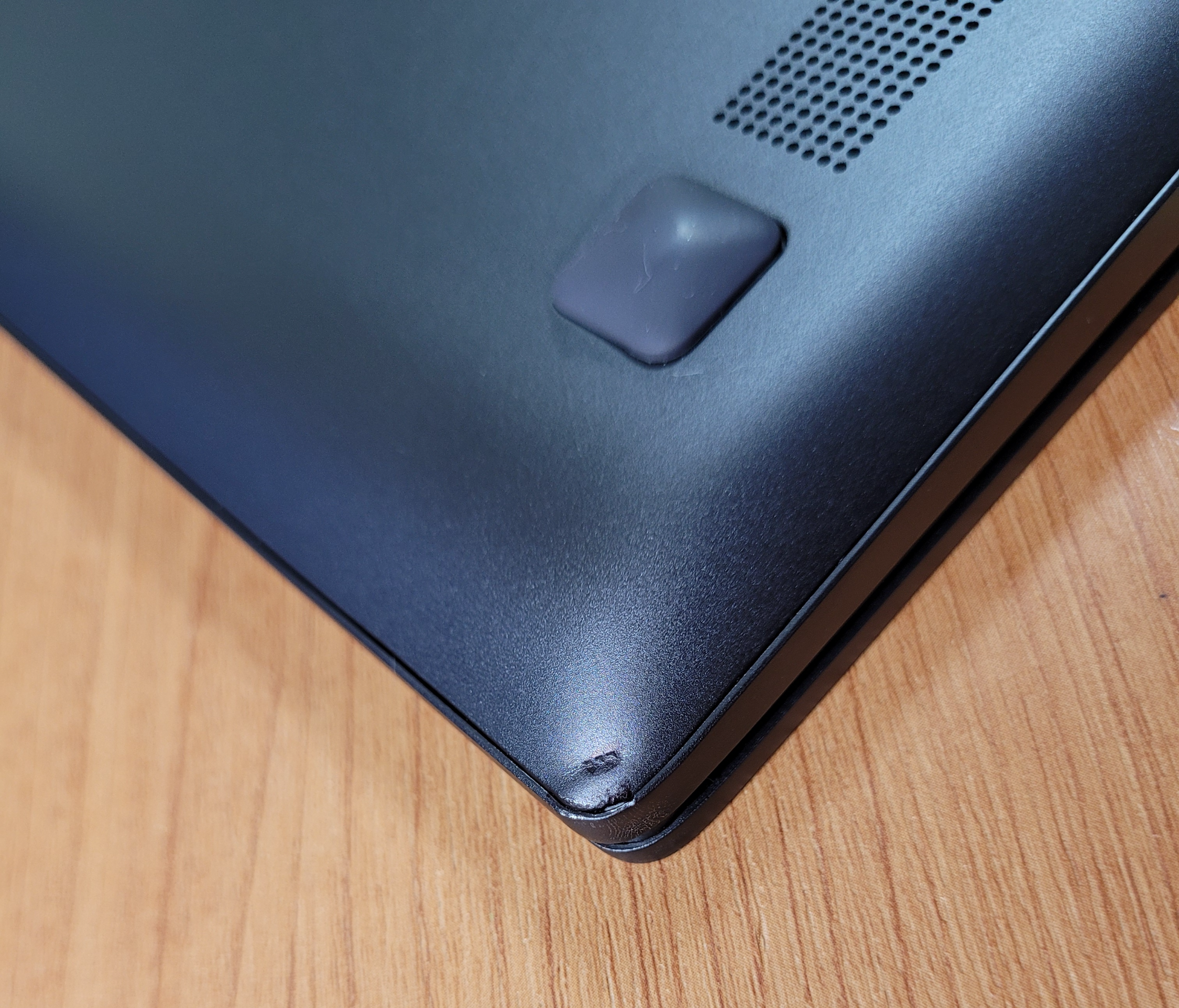 기존 순수 출고때 제품과 다른 점이라면 터치패드 우측에 인텔 CPU 코어i 스티커나, Arc 그래픽 스티커가 없고, 하단에 각종 인증 로고, 모델명, 제조년월일, 제조사, 제조번호 등이 깨알같이 표기된 부분이 없다. 심플해 졌지만 누가봐도 수리한 제품임이 티가 난다.