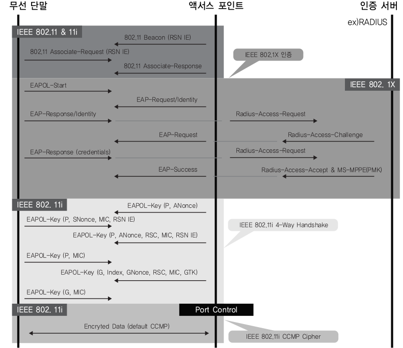 IEEE 802.11i 표준에서는 사용자 인증과 키 교환의 큰 틀로써 IEEE 802.1X를 사용한다고 규정하고 있으며, 나아가 구체적인 키 교환 방식인 4-단계 핸드쉐이크 방식 , 교환된 키의 계층적 사용구조 (key hierarchy), 그리고 새로운 무선 구간 암호 알고리즘(cipher suites)의 정의를 포함하고 있다. (그림 1)은 IEEE 802.1X 표준과 IEEE 802.11i 표준이 적용되는 무선랜 보안 접속 흐름도를 보이고 있다. 인증과 키 교환을 완료해서 액세스 포인트를 통한 외부 네트워크 연결이 허가되기 위해서는 IEEE 802.11 접속, IEEE 802.1X 인증, IEEE 802.11i 키 교환, 무선 구간 데이터 암호화가 유기적으로 연결되어야 한다.
