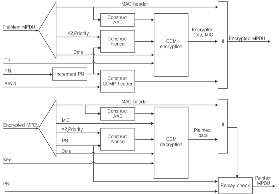 CCMP(Counter mode with CBC-MAC Protocol)는 CCM 모드를 사용하는 AES(Advanced Encryption Standard) 암호 알고리즘을 사용한다. (그림 5)는 CCMP 알고리즘의 암복호화 과정을 보여준다. 패킷 번호(PN, Packet Number)는 계속 증가하여 동일한 임시 키(TK, Temporal Key)에 중복되지 않도록 하여 재시도 공격(replay attack)을 방지하며, MAC헤더 정보의 일부인 추가 인증데이터 (AAD, Additional Authentication Data)를 CCM 암호화 과정에 포함시켜 위조를 방지한다.