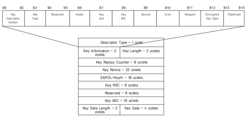 동적 키 생성을 위한 4-단계 핸드쉐이크는 (그림 2)와 같은 EAPOL-키 서술자 (EAPOL-Key Descriptor)를 이용하여 진행된다. EAPOL-키 서술자는 4-단계 핸드쉐이크 뿐만 아니라 그룹 키 핸드쉐이크와 단말 키 핸드쉐이크에서도 사용된다. 일대일 대칭 키(PTK)를 설립하는 것과 더불어 IEEE 802.11i 4-단계 핸드쉐이크는 MAC 계층에서의 보안 협상을 재확인 또는 변경할 수 있는 기능도 제공한다. 4-단계 핸드쉐이크의 두 번째, 세 번째 메시지는 EAPOL-키 서술자의 키 데이터(key data) 필드에 튼튼한 보안망 정보 요소(RSN IE, Robust Security Network Information Element)를 포함하고 있다. 튼튼한 보안망 정보 요소(RSN IE)는 무선 단말과 액세스 포인트 사이의 인증 방식과 암호 알고리즘에 대한 협상 정보를 지닌 메시지로써 무선랜 MAC 접속(association) 단계에서 교환되고 협상된다. 이러한 튼튼한 보안망 정보 요소(RSN IE)를 4-단계 핸드쉐이크 메시지에 포함시킴으로써 MAC 상위 계층에서 튼튼한 보안망 정보 요소(RSN IE) 정보를 재확인하고 해석할 수 있도록 했다.