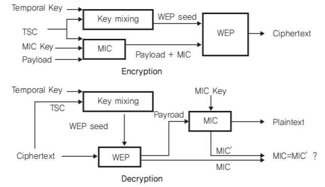 무선 구간 데이터를 보호하기 위한 방법으로 WEP(Wired Equivalent Privacy) 이외에 접속 과정에서 무선 단말과 액세스 포인트 사이에서 설립된 암호키를 사용하는 TKIP(Temporal Key Integrity Protocol) 알고리즘과 CCMP(Counter mode with CBC-MAC Protocol) 알고리즘이 있다. TKIP은 WEP을 확장하는 방법을 사용함으로써, 기존의 하드웨어 교체가 필요없이 구현할 수 있도록 설계되었다. TKIP에서는 WEP을 이용한 암호화 이전에 별도의 키 생성 과정을 거치게 하여, WEP에 적용되는 키가 각 데이터 프레임마다 변경되도록 하였다. 그리고, 메시지 무결성 코드인 MIC(Message Integrity Code)를 프레임에 포함시켰다. 이러한 방법으로 WEP 알고리즘의 취약점을 해결하였다. (그림 4)는 TKIP 알고리즘의 암복호화 과정을 보여준다.