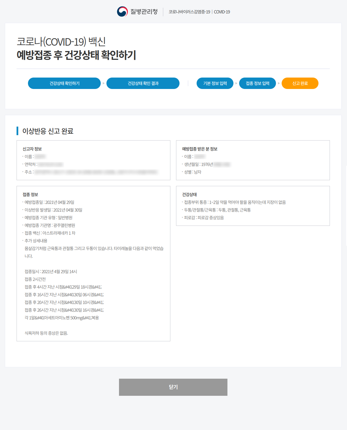 이상반응의 신고는 다음의 링크로 신청가능하다. PC에서는 nip.kdca.go.kr/irgd/covid.do?MnLv1=3 으로 접속하면 되고, 모바일의 경우는 nip.kdca.go.kr/irgd/cov19Info.do 로 접속하면 된다. 나의 경우는 아래와 같이 신고하였다. 신고만 하면 따로 연락이 오는지 모르겠으나 내일까지 두통과 근육통이 지속 된다면 접종한 병원에 가 볼 생각이다.