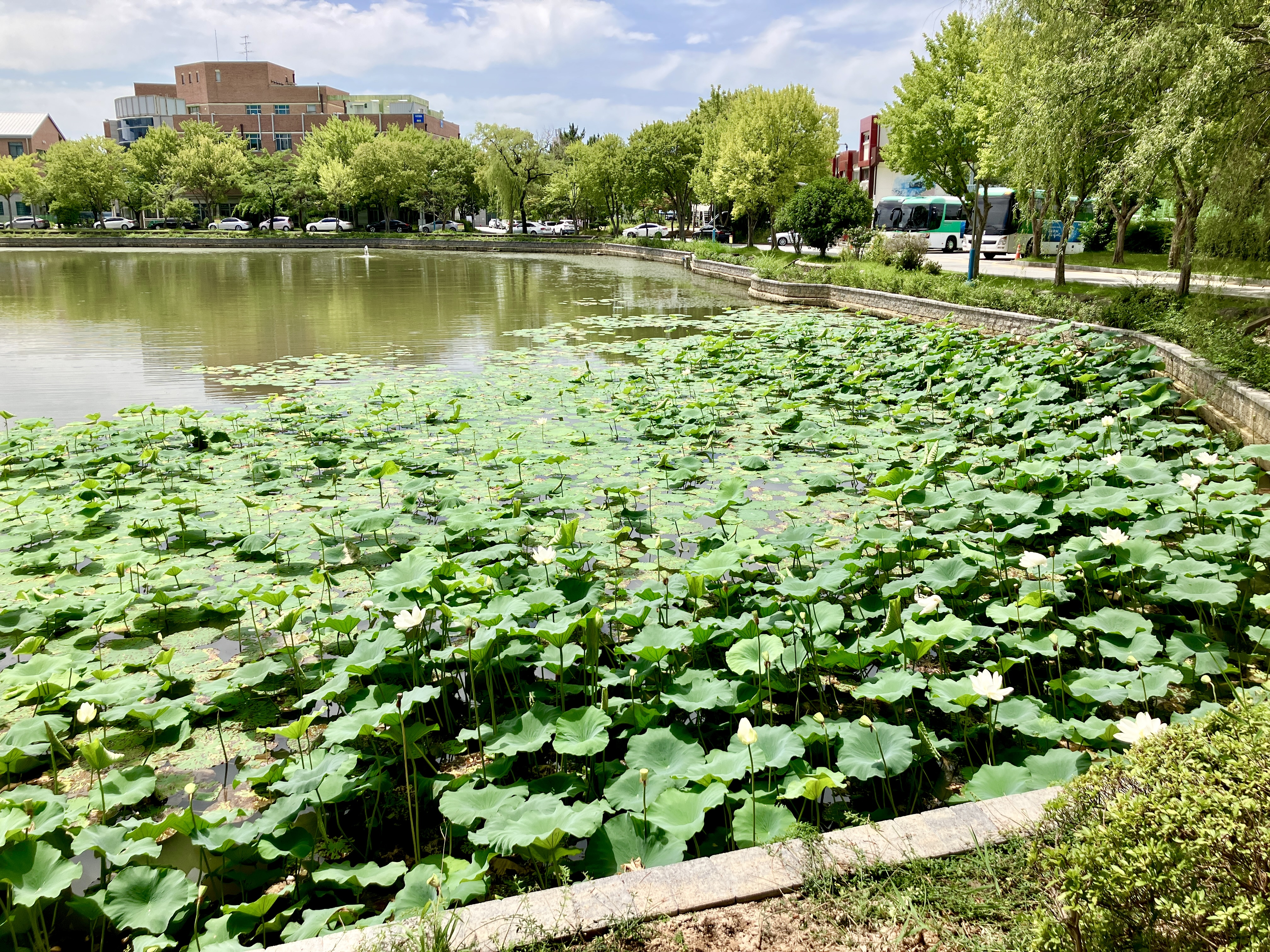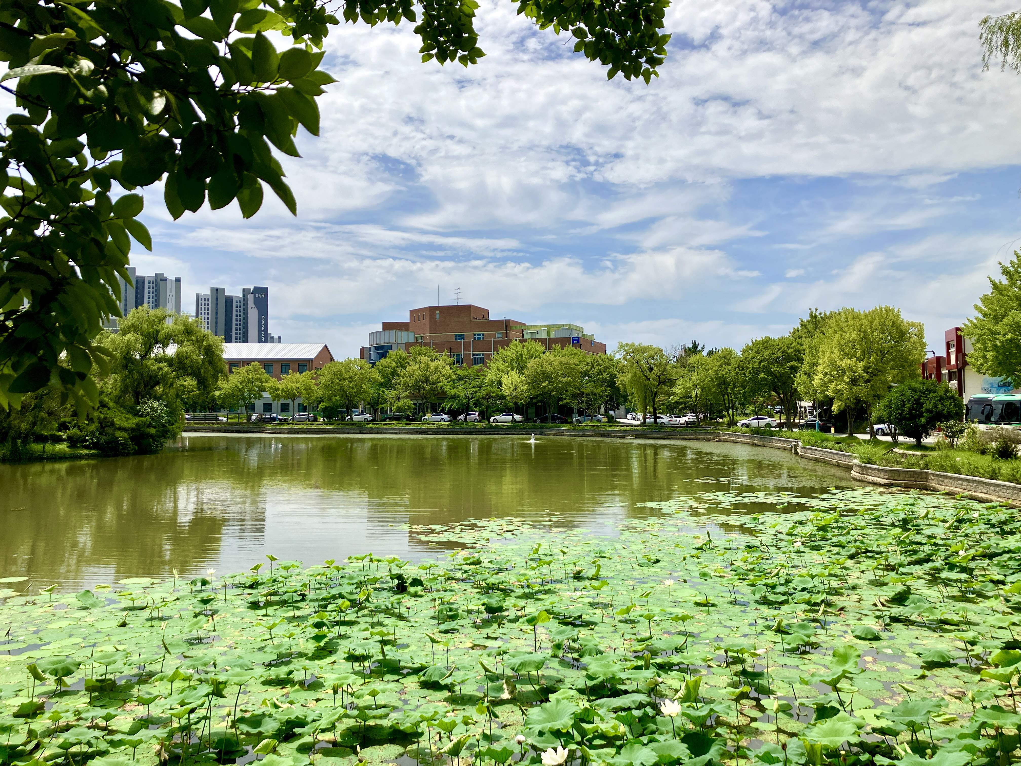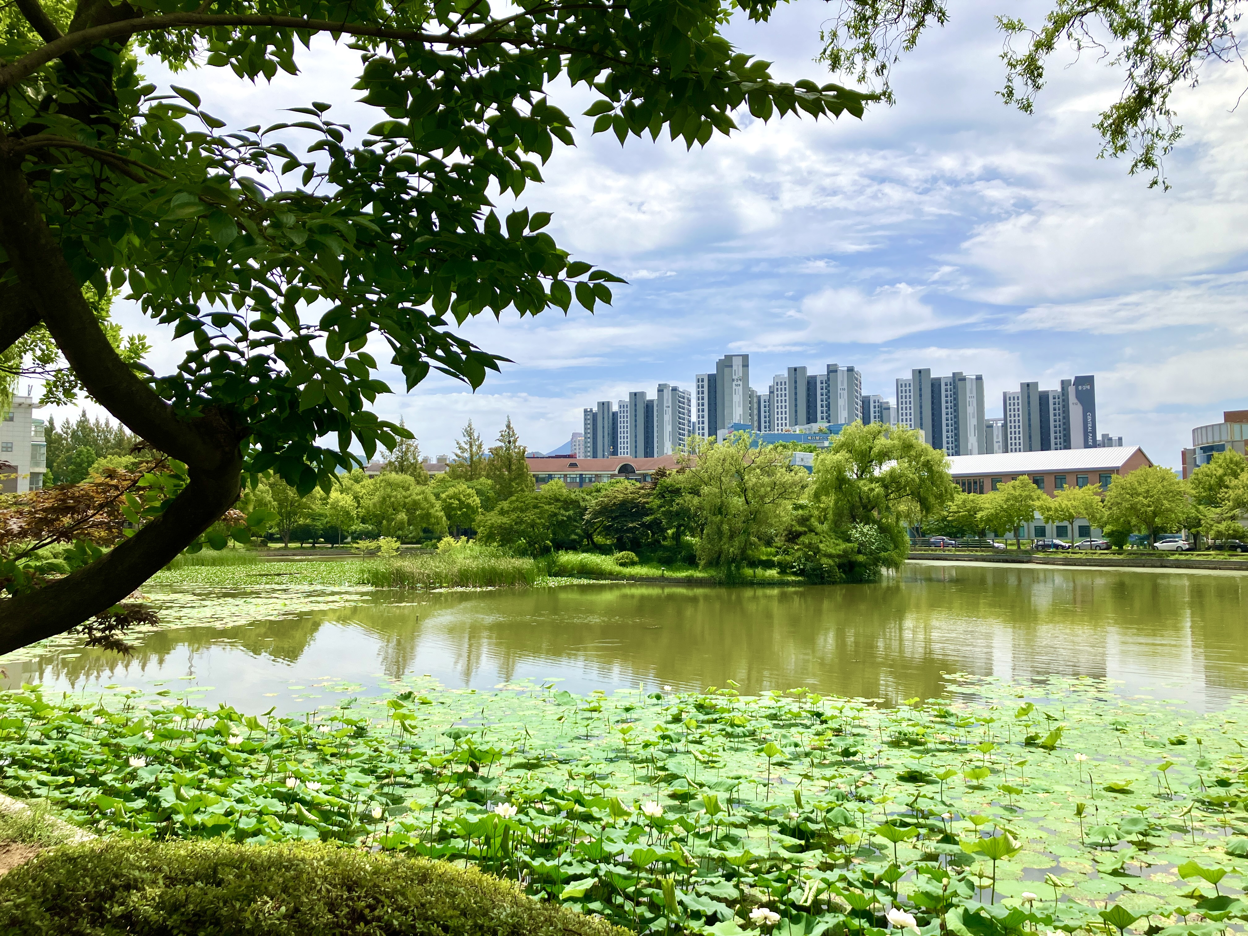 용지는 숲이 많이 우거졌네. 내가 다닐때는 연꽃 조금 있던거 같은데. 중앙에 작은 섬같은 조형물이 있어서 자라들이 쉬는거 많이 봤는데. 용지가 많이 예뻐졌다. 건너편엔 가정대. 그 뒤 아파트는 최근에 생긴 것이다.