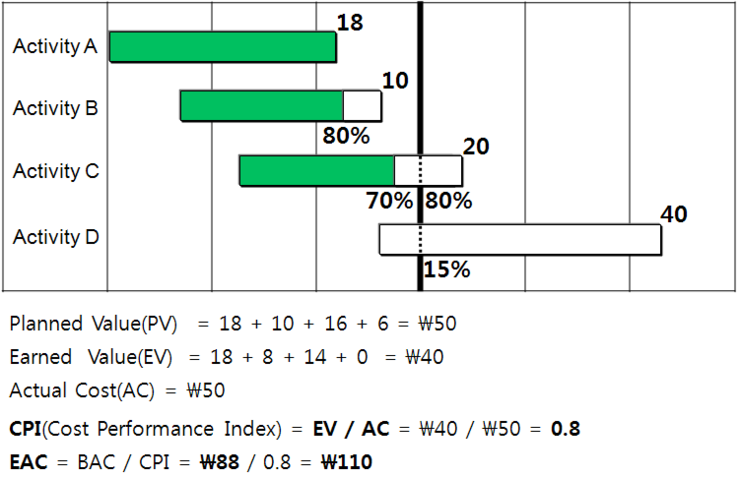 EAC | Estimating At Completion (프로젝트 완료 예산) EAC = AC + ETC = BAC / CPI |