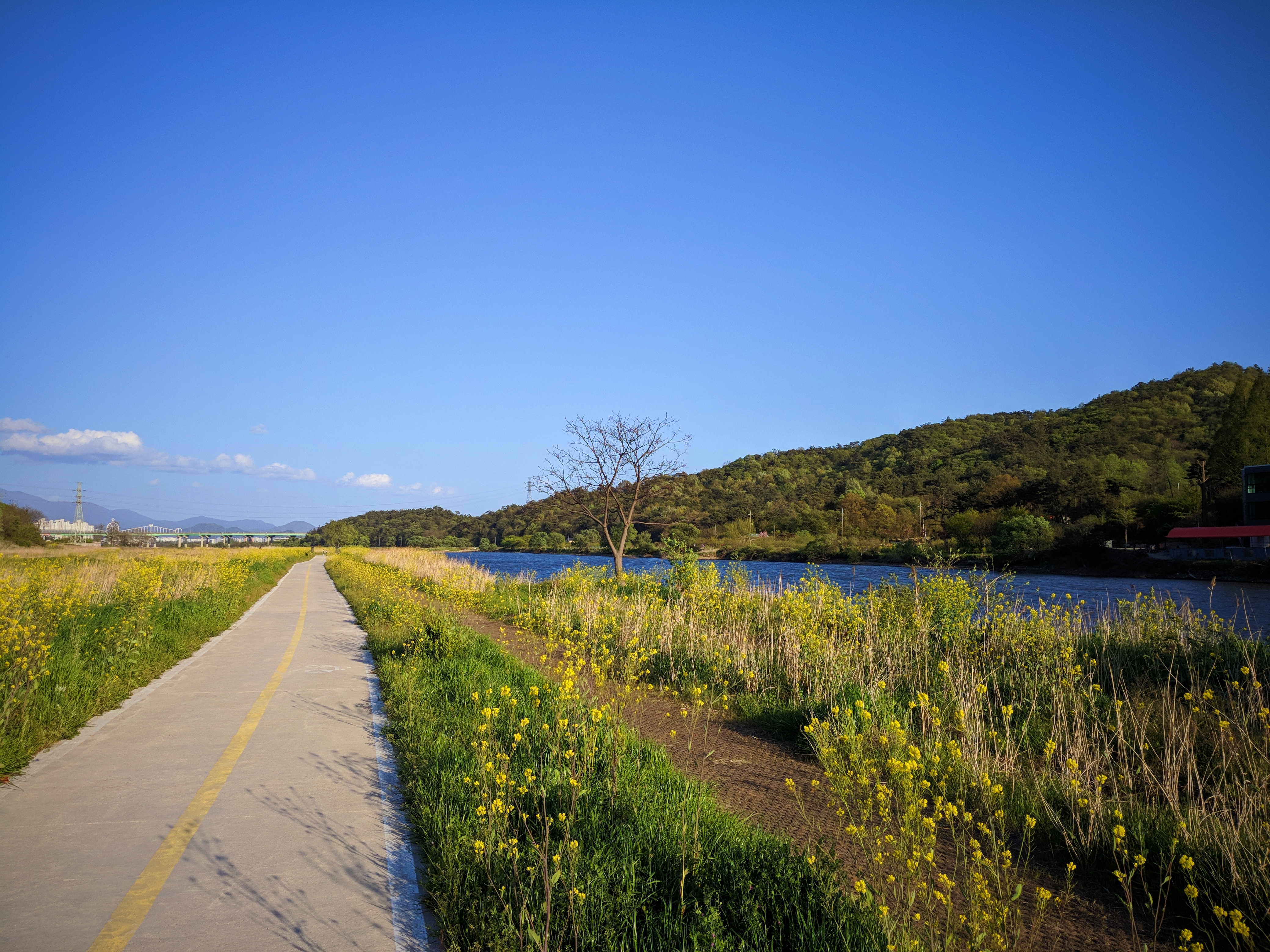이렇게 해서 오랜만에 하루 1만 5천보를 넘게 걸었습니다. 집에서 황룡강따라 송산유원지 근처 큰길가 카페까지 왕복하면 10km 가까이 되니까 운동은 될 법한데. 평소 목포(남악 전남경찰청)에서 퇴근해서 집에 오면 해가 넘어가버려 이 멋진 길을 걸을 수 없습니다. 가로등 좀 달아주면 좋겠는데. 집앞의 친수공원 유채꽃밭만 화려합니다. 물론 거기도 꽤 너비가 커서 한바퀴 돌면 2~3km는 족히 되지만요.
