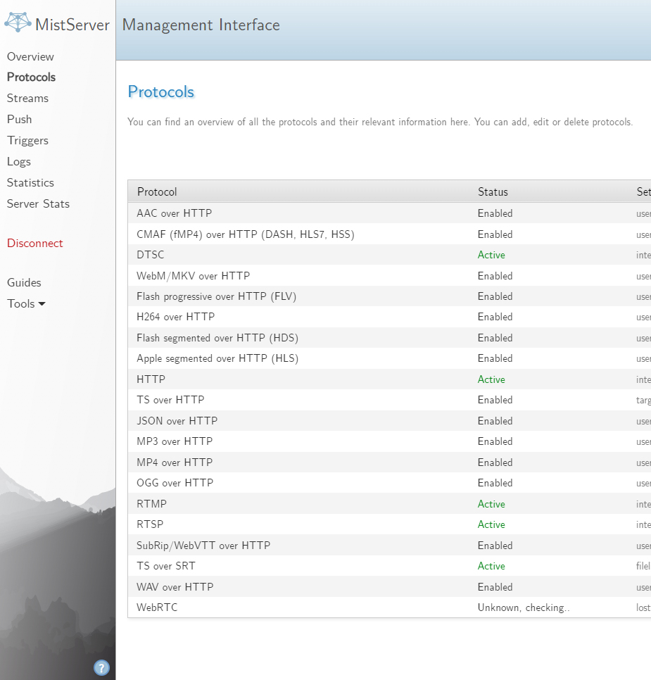 3.0버전의 Dashboard와 지원하는 프로토콜, 포맷 등은 다음의 스크린샷을 참조하세요. Web-UI에 접속해 보시면 찾아볼 수 있습니다. 비록 영어이긴 하지만 매뉴얼(https://mistserver.org/documentation)도 잘 정비되어 있습니다.