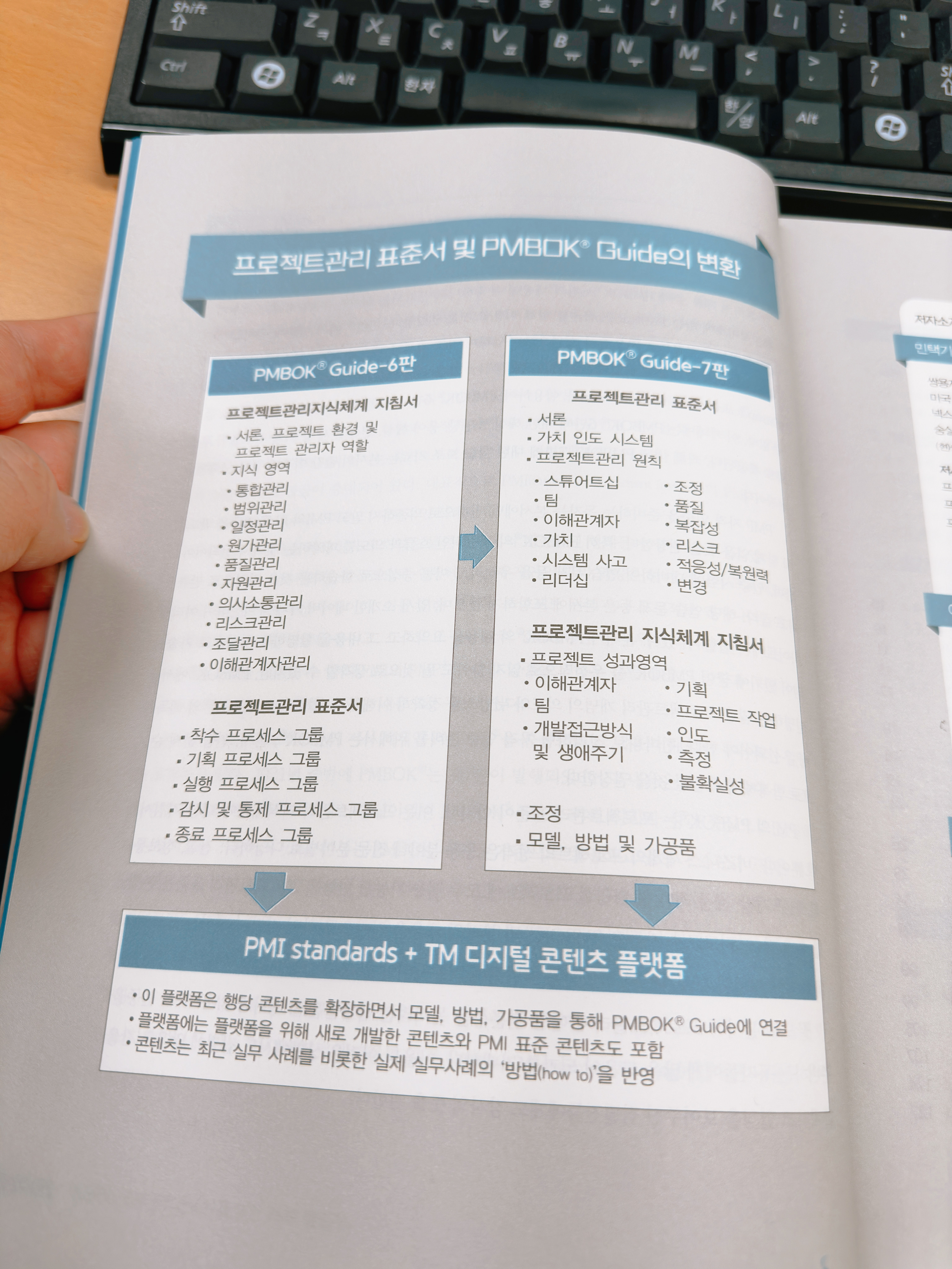 7판을 해설한 책(소동, PMP PM+P 해설서(7판), 김병호/유정근 저)도 내용이나 설명이 매우 좋지만 빠르게 원하는 내용을 공부해야 하는 감리사나 PMP 시험의 수험자에게는 가독성이나 찾아보기 측면에서 조금 불편했다. 내용적인 부분보다 편집상의 불편함이였다.