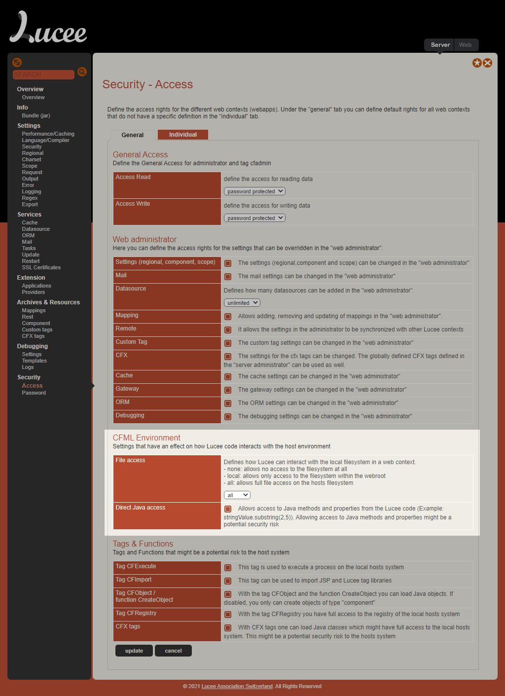 그래서 Lucee Server의 관리자에 들어가보면 아래 그림처럼 Securty 메뉴에 Access에 대한 다양한 보안기능을 제공합니다. 특히 이중 CFML Environment의 File Access 설정은 cfm문서내에서 파일을 읽고, 생성하고, 지우고, 이동하는 범위를 웹 파일들이 존재하는 Web root내로 제한할 것인지, 아니면 시스템 전체로 제한하지 않을 것인지를 설정하는 기능을 제어할 수 있습니다.
