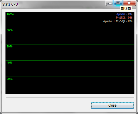 Server 텝에서는 Apache와 MySQL을 각각 실행/중지할 수 있는 버튼과 CPU모니터링을 할 수 있는 부분이 있고 Status 텝에서는 Apache와 MySQL의 실행상태여부와 CPU사용량 모니터링을 위한 도구가 있습니다. 막대그래프와 같이 생긴 버튼을 누르면 Real-Time으로 모니터닝하는 창이 뜹니다. 아래와 같습니다.